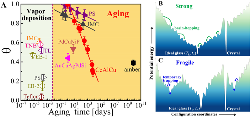 图4 (A) 镀膜或老化得到的超稳态玻璃的热力学稳定性θ= [(Tf-TK)/(Tg-TK)]。(B)强液体和(C)脆性液体的能垒图比较。Ce70Al10Cu20属于强玻璃体系,有助于其持续快速地往超稳态弛豫