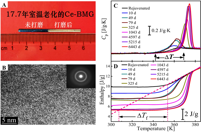 图3 Ce70Al10Cu20室温(0.85Tg)下老化17.7年后依然呈现出完美的非晶态,其热力学和动力性稳定性都有显著提升,表现出一种可以与琥珀媲美的高稳定性