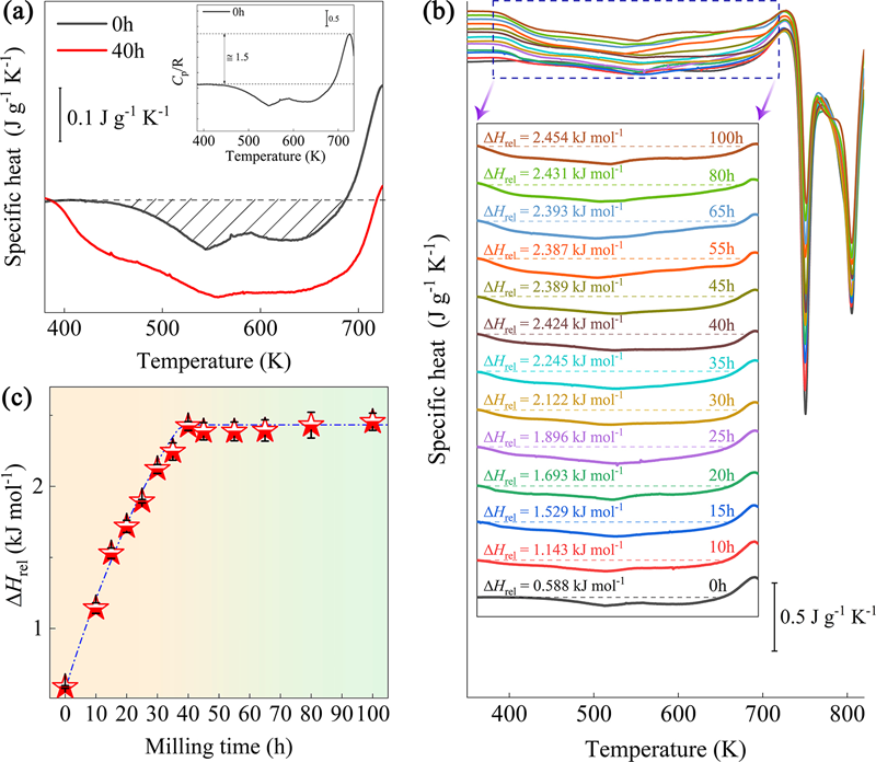 研究团队利用机械合金化,结合纳米压痕测试和热容测试等多种表征手段,对铜基非晶合金粉末进行了系统地研究。结果表明,随着能量注入的时间增长,非晶合金所储存的能量越多,在40h之后,体系所储存的能量达到饱和并保持稳定(图1)。这一饱和值达到了回春态非晶合金的能量新高(图2)。同时,对不同制备条件下获得的非晶合金进行长时间室温退火后发现,本文获得的高回春态非晶合金具备惊人的稳定性,可媲美超稳定玻璃(图3)。进一步的微观表征发现形成的类纳米非晶型核壳结构的界面势垒可阻止原子迁移(图4),提高了体系的稳定性。