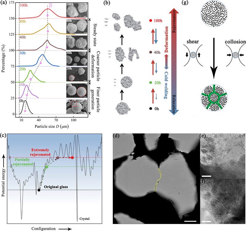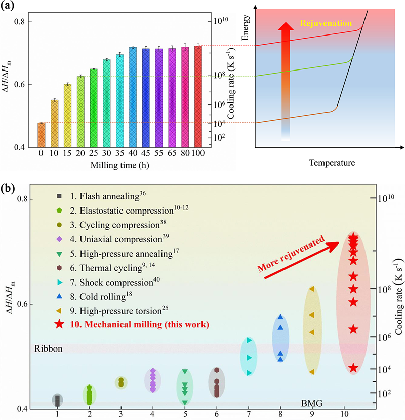 本工作通过机械合金化构筑类纳米非晶型核壳结构基元,利用核壳结构的界面势垒特性,成功获得了兼具高能态和高稳定性的非晶合金,深化了我们对于玻璃物质亚稳本质特性的认识,对探索具备独特性能的高能高稳定玻璃提供了参考。