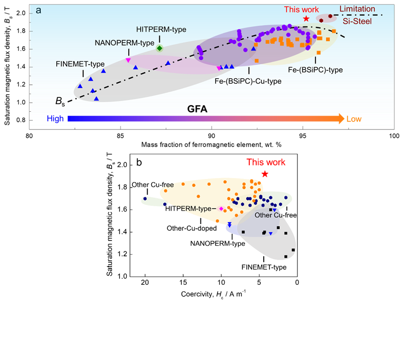 铁基非晶合金是目前已经得到大规模应用的非晶合金之一。由于其独特的无序结构,表现出极其优异的软磁性能,如低矫顽力、低损耗等特点,广泛应用于各类电力电子的磁性器件中,具有显著的节能环保优势。对这类非晶合金进行合适的热处理,可在非晶基体上析出细小、均匀的纳米晶体,从而得到纳米晶软磁合金,可使其性能进一步提高。现代电子电力设备逐渐向小型化、高效化和节能化发展,这要求软磁合金材料具有高饱和磁感应强度(Bs,有利于小型化)和低矫顽力(Hc,有利于低损耗)。然而,和常用的硅钢材料相比,非晶/纳米晶合金虽然矫顽力较小,但Bs值较低(目前商用的材料一般在1.7T以下)。在过去的几十年中,为了提高软磁非晶/纳米晶合金的Bs值,各国研究者们已做了大量努力。在合金中增加铁磁性元素含量的设计策略是其中最有效、也是最广泛使用的方法。一些含有少量类金属元素和超高铁磁性元素含量的Fe-(BSiPC)和Fe-(BSiPC)-Cu等合金体系也相继被开发出来。但是,铁磁性元素含量的增加会导致其合金非晶形成能力迅速下降,使纳米晶形核长大过程变得苛刻且难以控制,在随后的热处理过程中很难获得低Hc。这导致目前非晶/纳米晶合金的Bs和Hc之间通常存在互斥关系。如何同时获得高Bs和低Hc成为当前软磁非晶合金研究中的一个重要挑战,对其在高功率密度场景中的应用也至关重要。