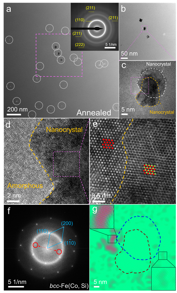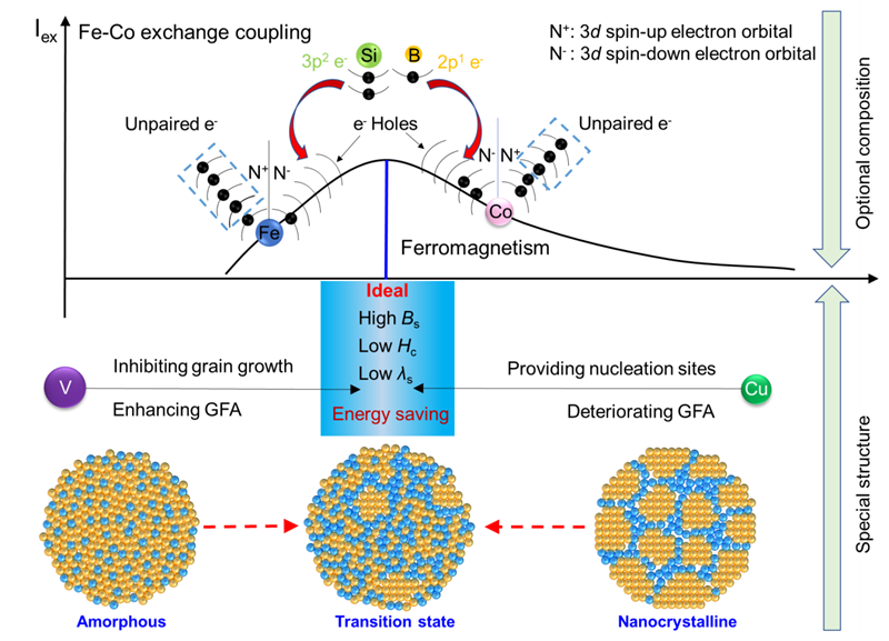 图1 合金设计理念。选择合适的铁磁性元素比例(例如,Fe,Co等)以提高交换耦合作用并保持较高的非晶形成能力,同时添加微合金化元素(例如,Cu,V等)以形成可控的纳米晶结构