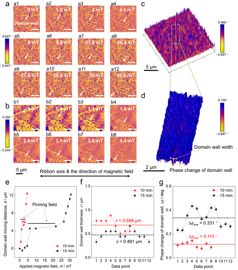 不同于以往通过提高铁磁性元素含量的成分设计方法,这里通过添加适量Co元素以提高其交换耦合作用,并微合金化Cu、V等元素来平衡非晶形成能力、软磁性能和形核长大之间的相互关系(图1),通过适量实验验证,设计了成分为(Fe0.8Co0.2)85B12Si2V0.5Cu0.5的合金。通过熔体甩带法,制备得到了嵌套纳米晶体稀疏分散在非晶基体中的独特微观结构(图2)。和传统纳米晶合金相比,该合金中的纳米晶体积分数仅为0.5%,同时在纳米晶周围还有尺寸小于5nm尺寸的类晶体团簇。经过磁性能测试,该非晶-纳米晶过渡态合金具有高达1.94T的Bs和低至4.3A/m的Hc。该材料的Bs为迄今为止纳米晶合金材料中的最高值,同时Hc 也很接近于纳米晶合金材料的最低极限(~1A/m),因此打破了铁基纳米晶合金家族中Bs和Hc之间的互斥关系(图3)。研究发现,极高的Bs值是局部磁矩强交换相互作用的结果,这是由适当添加的Co元素和析出小尺寸弥散分布的嵌套纳米晶体(以及<5nm尺寸的类晶体结构)共同作用所导致的。此外,该研究还利用磁力显微镜(MFM)原位观察了外加磁场作用下畴壁的结构和运动方式,发现低Hc起源于畴壁的弱钉扎效应(图4)以及由这种独特的微观结构所导致的低磁各向异性。