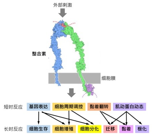 整合素(integrin)又称整联蛋白、接合蛋白,是一种介导细胞和其外环境之间的连接的跨膜受体,普遍存在于脊椎动物的细胞表面。作为细胞粘附分子家族的重要组成部分,整合素参与细胞增殖、分化、黏附和迁移等过程,在多种病理过程中发挥重要作用 (下图),作为生物医药以及生物材料开发的主要靶点,一直备受关注。