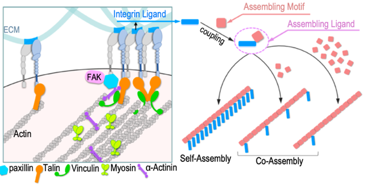 图1 通过多肽组装实现对整合素配体二维分布的精准调控的设计理念。