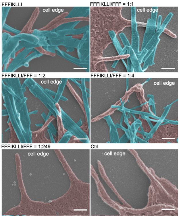 图2 扫描电镜下,具备不同整合素配体二维呈现的纳米材料(蓝色)与靶向肝癌细胞丝状伪足 (粉色)的亲和度体现。比例尺代表300纳米。