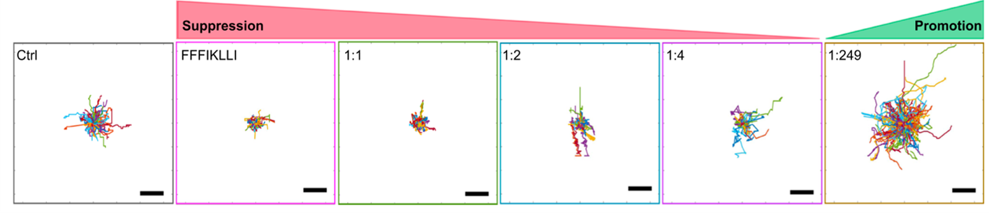 为了打破现有局限,松山湖材料实验室智能软物质团队设计了一种自下而上的纳米制造策略,通过使用可用作药剂制备的多肽配方,结合多肽修饰、分子自组装,以及分子共组装等纳米材料制备技术,将整合素纳米材料的空间分辨率提高到分子水平(图1)。通过纳米生物界面相互作用差异化(图2),不仅实现了选择性的对靶向癌细胞迁移的双向精准调控(图3),并阐释了新型抑癌生物材料的设计策略以及其功能机制,为肿瘤转移治疗提供了新思路。