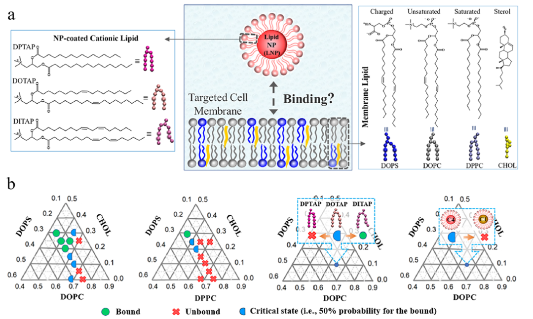 不同类型的细胞膜具有特定的脂质组成特征(包括电荷、脂质饱和度、胆固醇含量等)。研究者们通过对二十余种具有不同组分的脂膜与近十类包覆有不同脂质或具有不同性质颗粒核心的脂质纳米颗粒之间的相互作用情况进行系统研究后发现,脂质纳米颗粒与不同组分的膜的结合差异性很大。例如,随着膜内胆固醇含量增加,脂质纳米颗粒与膜结合概率会显著增大;而在胆固醇含量相同的条件下,当膜中饱和脂质分子(如DPPC)被不饱和脂质分子(如DOPC)取代时,脂质纳米颗粒与脂膜的结合会变得更加容易。此外,脂质纳米颗粒的性质(例如,包覆脂质的饱和性、纳米颗粒的亲疏水性)也会影响其与膜结合。