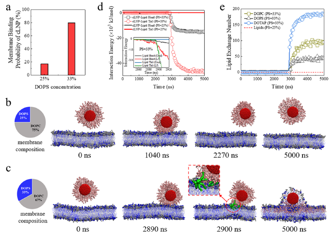 脂质纳米颗粒与膜的结合呈现由“吸附”到“脂质交换”的“两步机制”。首先,研究表明脂质纳米颗粒与膜的结合对细胞膜的带电状态很敏感。例如,脂质纳米颗粒很难与组分为DOPC:DOPS = 75:25的脂膜结合,但是当带电脂质DOPS的百分比增加到33%后,脂质纳米颗粒与膜结合概率可增加5倍。这些结果似乎表明脂质纳米颗粒与膜的结合是由静电相互作用所主导。其次,研究者们的进一步研究发现,静电相互作用所导致的颗粒与脂膜的接触只是两者结合的第一步,而随后的脂质交换行为对于两者形成稳定的结合状态则更为关键:包覆在颗粒表面的脂质分子会从颗粒上脱离、翻转,并插入膜内;而脂膜中的脂质分子也会从膜中脱离、吸附到颗粒表面。这一“两步机制”的发现有助于对脂质纳米颗粒对不同组分脂膜的选择性结合行为的理解。