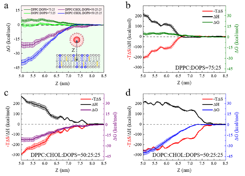图3. 脂质纳米颗粒与膜相互作用过程中自由能、熵和焓的变化