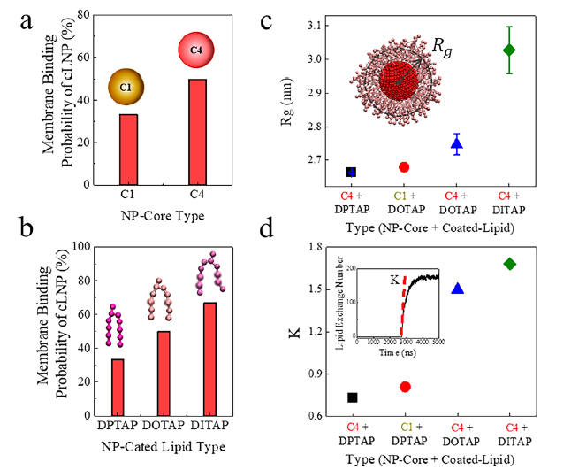 探索熵和焓之间的竞争对于理解脂质纳米颗粒与膜结合作用的物理本质极为关键。研究者进一步通过计算不同纳米颗粒与膜相互作用过程中自由能、焓和熵等物理量的变化后发现,脂质纳米颗粒与膜的结合过程中自由能的降低主要取决于熵的变化。两者作用中熵的变化主要包括:当脂质纳米颗??拷な?,系统的构象熵会由于颗粒与膜接触区域的脂质分子排列状态发生改变而增加;而随着包覆脂质分子与膜内脂质分子的交换等过程,系统的构象熵还会进一步增加。总的来说,脂质纳米颗粒与膜结合是一个熵驱动的过程。