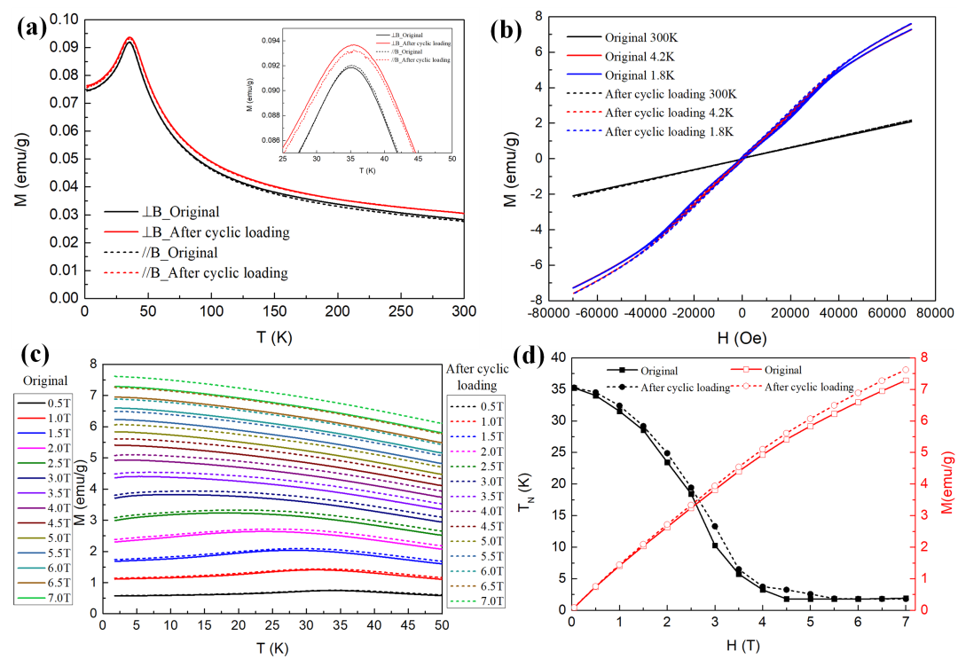 图 2. 316LN奥氏体不锈钢原始母材及4.2 K温度下疲劳循环后的不同磁场强度下的磁性能测试。材料的磁化率对磁场的方向不敏感,对磁场强度有较大的依赖性,4.5T背场下从反铁磁性性转变为铁磁性。材料经历低温疲劳循环前后,不同磁场强度和方向下磁化率并未发生明显的变化,材料经历低温疲劳循环后展现了优异的组织稳定性。