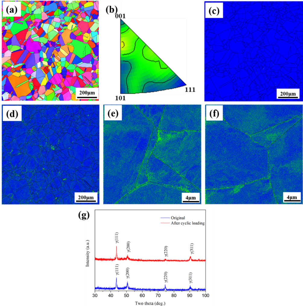 图 3. 4.2 K温度下疲劳循环后 316LN奥氏体不锈钢的EBSD(电子背散射衍射)及XRD图。经历低温疲劳循环后,材料始终呈现单相的奥氏体组织,组织取向并未明显改变,晶界及其附近的呈现高密度的应变分布。