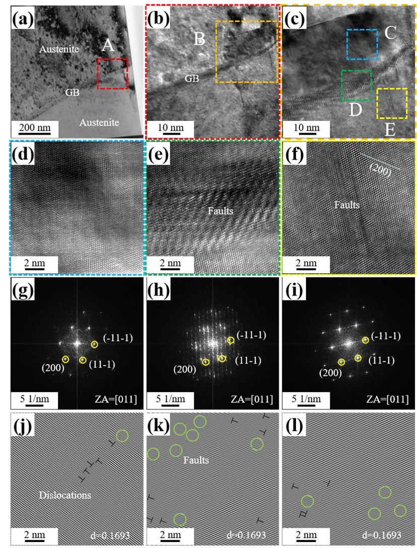图 4.HRTEM表征了4.2 K温度下疲劳循环后316LN奥氏体不锈钢晶界附近的微观结构。本研究用聚焦离子束(FIB)方法将应变集中的晶界区域制成TEM箔片,用于HRTEM检测。4.2 K温度下疲劳循环后晶界处分布着大量的位错和堆积层错,有别于大应变速率下马氏体相变的产生,证实了材料服役条件下组织的稳定性。