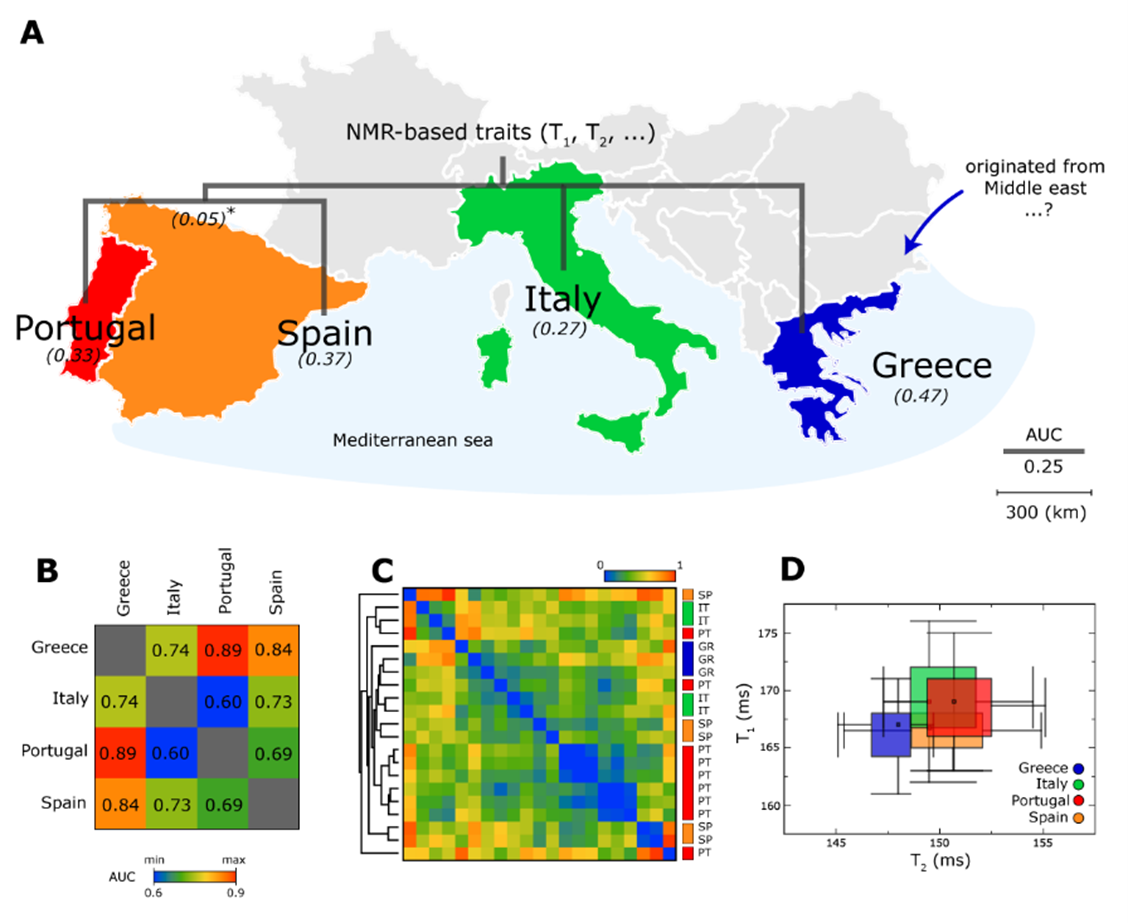 基于新型时域核磁共振技术研发的食用油原产地鉴别法:A.基于自有NMR技术分析结果所描绘的进化树,为利用AUC模型分析所得——AUC算法结果显示出三种地区特异性(伊比利亚、希腊、意大利),并将两相邻国家:葡萄牙与西班牙归类为无差异性的一个地区(伊比利亚地区),证明地理位置对基因存在影响。B.利用ROC曲线所呈现的不同国家样本间的AUC指标分布状态。C.以热力图所呈现的各个品牌食用油通过自有NMR系统测量所得。层次聚类是依据样本平均值的欧氏距离(介乎T1、T2弛豫、A比例)所得。D.不同产地样本的T1-T2磁态。