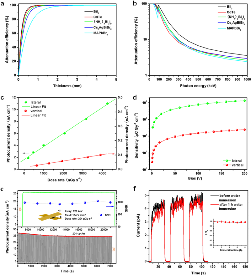 异质结构碘化铋具有优良的X-射线吸收性能及高灵敏度,重复/长时间连续X-射线照射及冷水浸泡实验表明有良好的辐射及潮湿环境稳定性(图3)。材料无毒环保,制备过程简易,成本低,在较高电压(50~200 V)下仍有良好信噪比,有望用于CT图像领域。