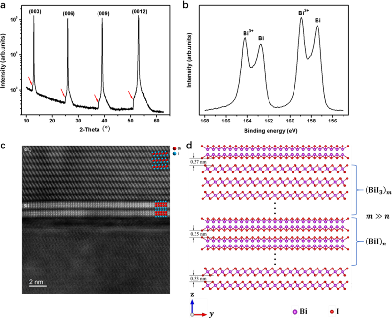 通过XRD,XPS和STEM证实I-Bi-I三原子层和I-Bi-Bi-I四原子层通过范德华力堆叠形成的超结构(图2)。I-Bi-Bi-I四原子层内部存在Bi双原子层,具有高电子迁移率,有利于电荷传输。