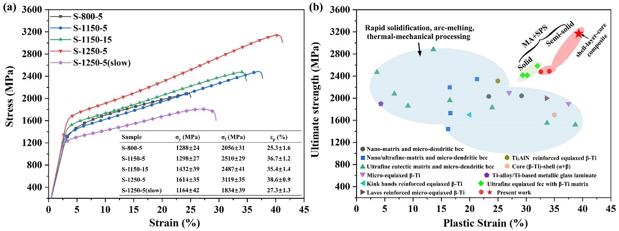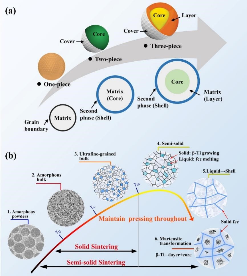 近日,松山湖材料实验室非晶材料团队的汪卫华研究员、柯海波研究员联合密苏里科技大学温海明副教授、华南理工大学杨超教授等,通过全新工艺设计,成功开发兼具高压缩强度(3119 MPa)与大塑性(38.6%)的“壳-层-核”三层结构钛合金,克服了引入增强相导致的强塑性矛盾,为开发高强韧结构材料提供新思路。