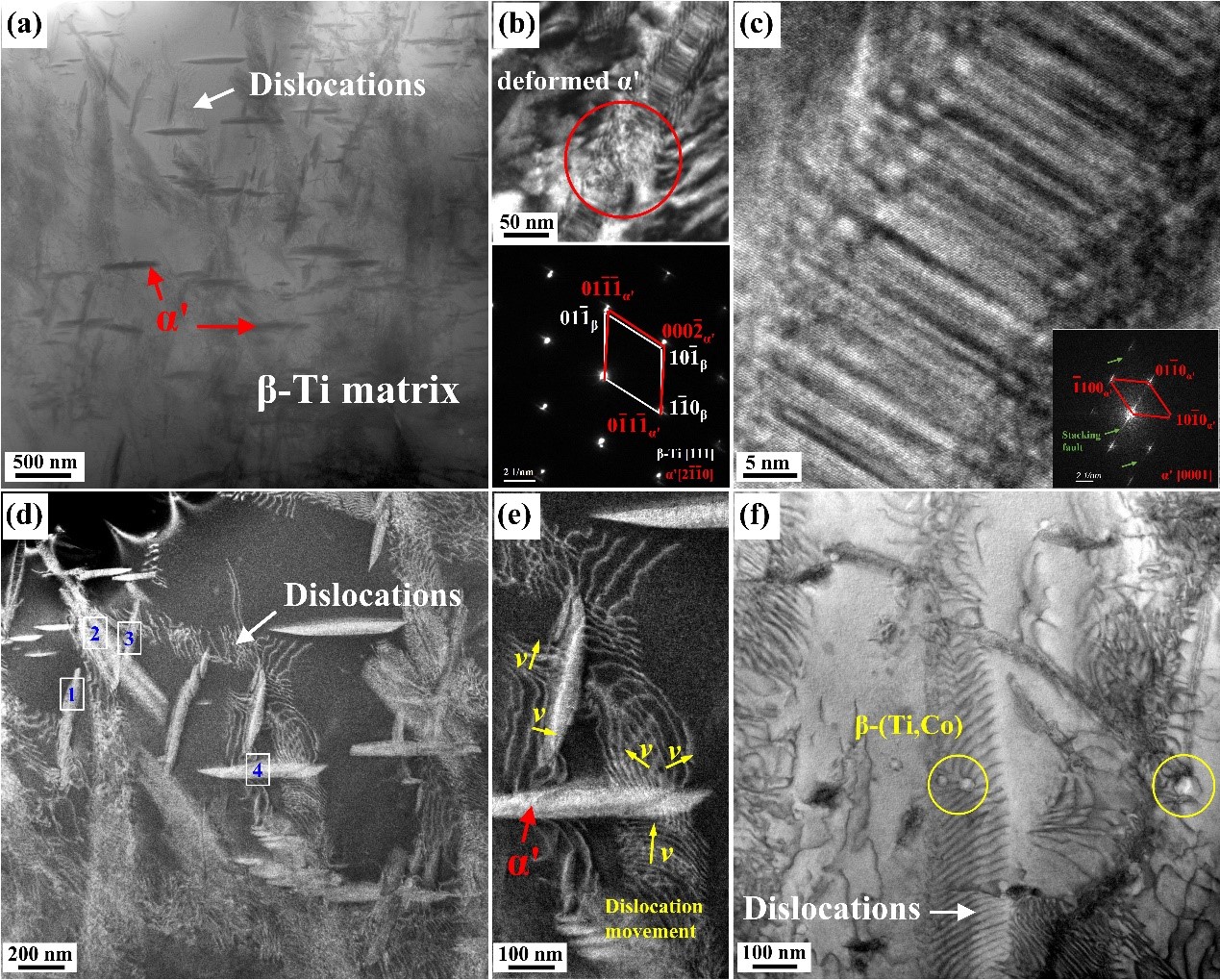 受三层高尔夫球结构启发,研究团队设计基于单相熔化的半固态烧结法(图1),制备具有“壳-层-核”结构的新型Ti68.8Nb13.6Co6Cu5.1Al6.5钛合金。区别于外加引入增强相或后处理搭建“核-壳”结构的传统思路,本工作通过半固态烧结调控CoTi2相的形态与分布,原位实现全新的三层结构。本研究以机械合金化Ti68.8Nb13.6Co6Cu5.1Al6.5非晶/纳米晶粉末为原料。该粉末晶化析出fcc CoTi2 (Tm=1138 ℃)相和bcc β-Ti (Tm>1577 ℃)相。通过在CoTi2相与β-Ti相熔点间的特定温度(1250 ℃)开展放电等离子烧结,在钛合金中实现了壳(CoTi2)-层(β-Ti)-核(α'马氏体)独特的微观结构(图2)。半固态烧结时,CoTi2相从非晶基体析出并熔化。液态CoTi2被β-Ti晶粒长大内应力和外加压力挤压至β-Ti边界。冷却时,液态CoTi2凝固成壳,围绕在β-Ti基体边界。另一方面,快冷和外加压力促使α'马氏体从β-Ti基体沿特定取向析出,最终在β-Ti芯部区域聚集,形成马氏体核(图2)。全新结构的Ti68.8Nb13.6Co6Cu5.1Al6.5钛合金实现1614 MPa压缩屈服强度,3119 MPa压缩极限强度和38.6%的压缩应变(图3),兼具高强度和高塑性。研究发现,硬质CoTi2相壳结构分布和α'马氏体核阻碍位错运动提高强度。微米晶β-Ti基体保证合金塑性,而CoTi2相分布,α'马氏体包含的层错协同诱发bcc β-Ti相的交滑移,近一步提高新结构钛合金的变形能力(图4)。