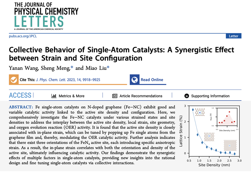 这一结果近日发表于《The Journal of Physical Chemistry Letters》,论文题为“Collective Behavior of Single-Atom Catalysts: A Synergistic Effect between Strain and Site Configuration”。孟胜、刘淼研究员是本项研究的通讯作者,王亚南是本项研究的第一作者。