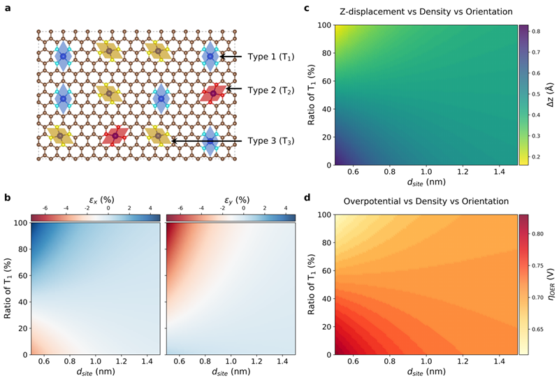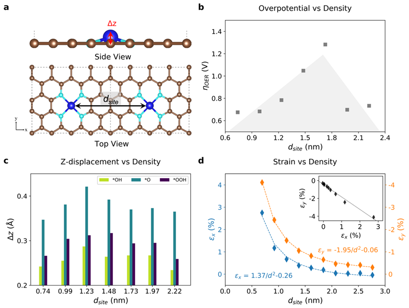 进一步的系统分析,给出了单原子位点的密度、取向与OER催化活性的构效关系“地图”。随着活性位点间距从0.74增加至2.96纳米,活性位点引起的x和y方向晶格应变分别从2.75%的拉伸应变减少至0.01%,以及从-4.11%的压缩应变减少至-0.30%,催化反应的活性也表现出先上升后下降的行为。该研究结果很好的解释了之前的实验观测。