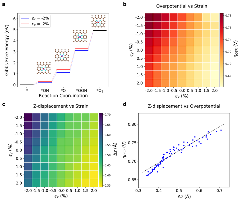 图2. 晶格应变调控OER催化性能。(a)不同晶格应变下的OER自由能图;(b-c) OER过电位和z方向位移的应变依赖图;(d) z方向位移与OER过电位的线性关系图。