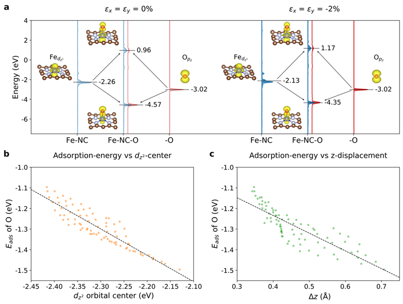 图3. 晶格应变影响催化性能的理论机制。(a) Fe dz2轨道与O pz轨道的相互作用图;(b-c) dz2轨道中心和z方向位移与吸附能的线性关系图。