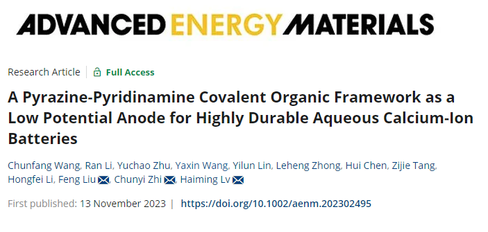 相关成果以“A Pyrazine-Pyridinamine Covalent Organic Framework as a Low Potential Anode for Highly-durable Aqueous Calcium Ion Batteries”为题在国际著名期刊Advanced Energy Materials上发表。联合培养博士王春芳为第一作者,松山湖材料实验室副研究员吕海明,香港城市大学支春义教授和中南大学刘锋副研究员为共同通讯作者,上述研究工作得到了松山湖材料实验室创新样板工厂团队项目、广东省基础与应用基础基金等支持。