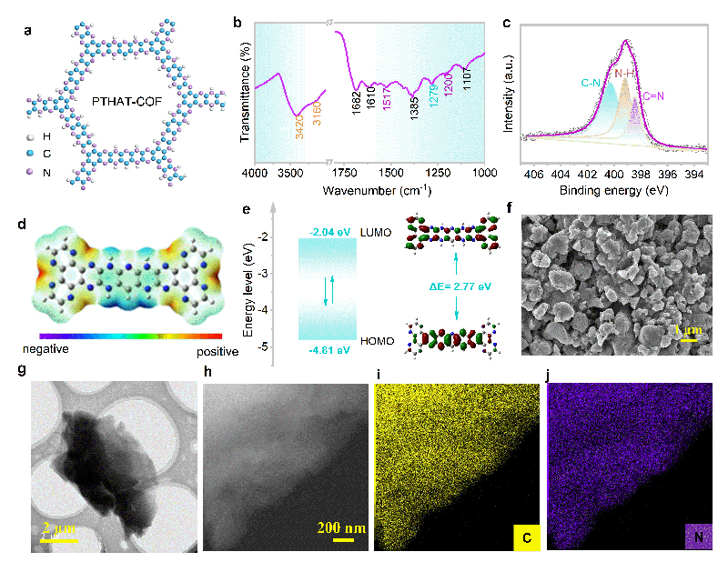 图1:PTHAT-COF的表征: a)球棒结构模型,b)FT-IR光谱,c)N 1s峰的XPS图案。d)重复单元的优化结构和计算的分子轨道能级。e)计算重复单元的MESP分布。f)FESEM和g)TEM 图像。h)HAADF图像。i)C元素和j)N元素的EDS映射。