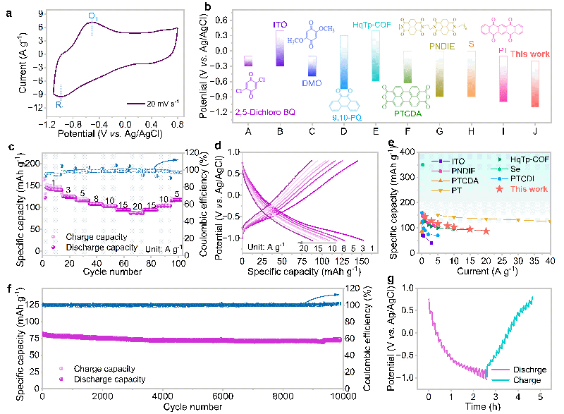 图2:PTHAT-COF作为CIB阳极的电化学和动力学性能:a)20 mV s-1下的CV曲线。b)PTHAT-COF与其他负极材料在水性电解质中的放电/充电电压范围的比较。c)不同电流密度下的比容量和相应的库仑效率。d)不同电流密度下的GCD曲线。e)钙电池负极比容量比较。f)20 A g-1下的循环性能。g)0.2 mA时的GITT曲线。