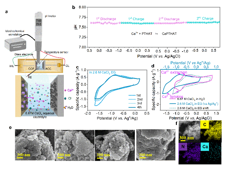 图3:PTHAT-COF作为CIBs阳极在6.67 M CaCl2水溶液中的存储机理:a)以PTHAT-COF为工作电极的三电极原位pH测试装置充放电过程示意图。b)前两个循环期间PTHAT-COF电极一侧的原位pH变化。c)PTHAT-COF阳极在饱和CaCl2 EG溶液中在1 mV s-1下前四个循环的CV曲线。d)PTHAT-COF在饱和CaCl2 EG溶液和饱和CaCl2水溶液中在1 mV s-1下的CV比较。e)PTHAT-COF电极在不同状态下的FESEM图像。f)PTHAT-COF电极在第二放电状态下的HAADF和EDS图。
