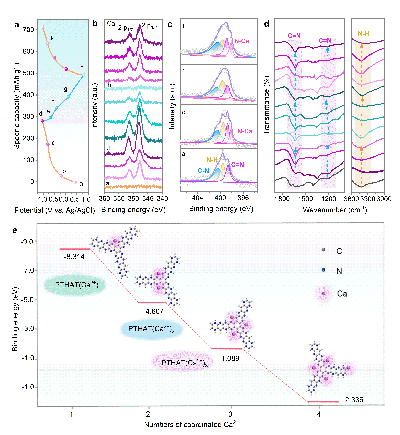图4:PTHAT-COF负极的电荷存储机制研究:a)PTHAT-COF负极在6.67 M CaCl2水系电解质中不同充放电深度的GCD曲线。b)Ca 2p和c)N 1s的非原位XPS光谱。d)非原位FT-IR光谱。e)PTHAT-COF重复单元在放电过程中的结构演变。