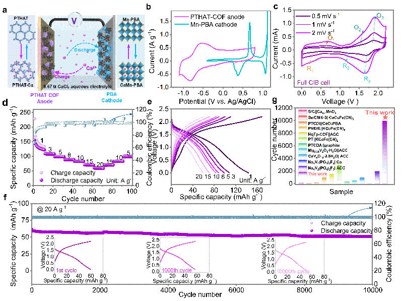 图5:基于PTHAT-COF阳极和Mn-PBA阴极的全CIB电池:a)钙离子全电池反应机理示意图。b)PTHAT-COF阳极和Mn-PBA阴极在0.5 mV s-1下的CV比较。c)全电池在0.5至5 mV s-1扫描速率下的CV曲线。d)不同电流密度下的倍率能力。e)不同电流密度下的GCD曲线。f)20 A g-1下的循环性能。g)循环性能比较。
