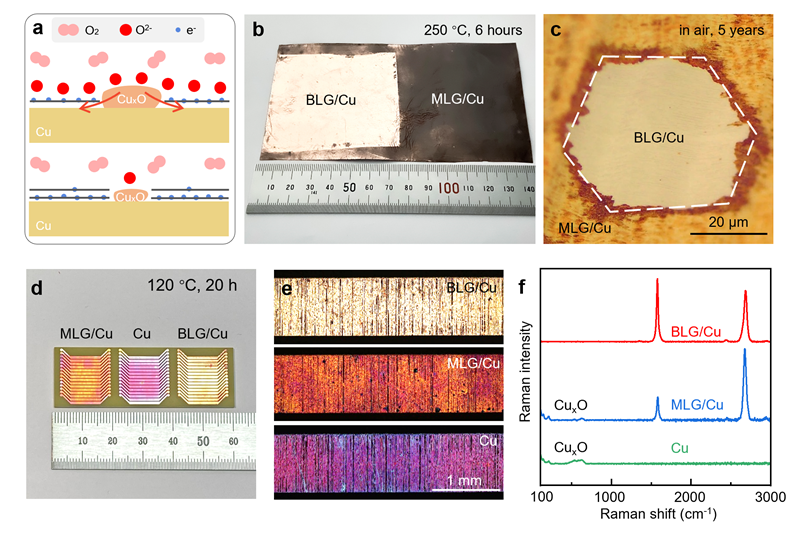 铜因其优良的物理性质(高导电性、高导热性等)而广泛应用于电力电子、半导体工业之中。但是,铜易受腐蚀的特性极大限制了其高端应用的开发,例如,当暴露在200℃的空气中仅30分钟后,铜导线的电导率就会下降99.99999%。目前,人们普遍使用传统的有机涂层法或牺牲阳极法等对铜进行?;?,但是,这些方法通常依赖于较厚的涂层,难以满足高端器件微型化的需要。石墨烯因在单原子层厚度上具备优异的防渗透能力和极高的化学稳定性,被认为是金属?;ね坎愕闹匾秆≈?。然而,石墨烯-金属体系通常具有弱的界面耦合作用和强的表面电化学活性,有研究表明,在长时间、高湿度的环境下,石墨烯甚至会加速铜的腐蚀。因此,亟需开发一种能有效阻断界面扩散和电化学腐蚀的原子级防腐技术,为下一代高端电子产业中铜的应用开辟道路。