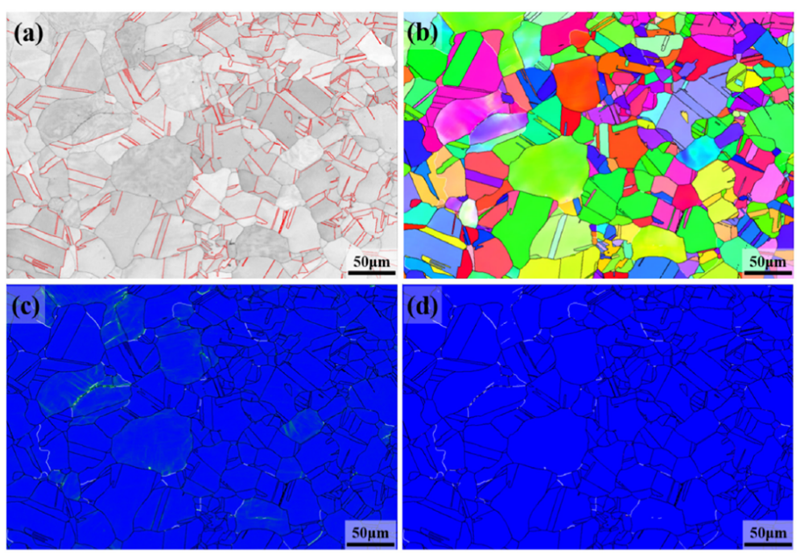 图1 Fe-Cr-Ni-M-N奥氏体不锈钢EBSD图:(a)BC图,(b)IPF图,(c)KAM图,(d)相图,为单一FCC相。