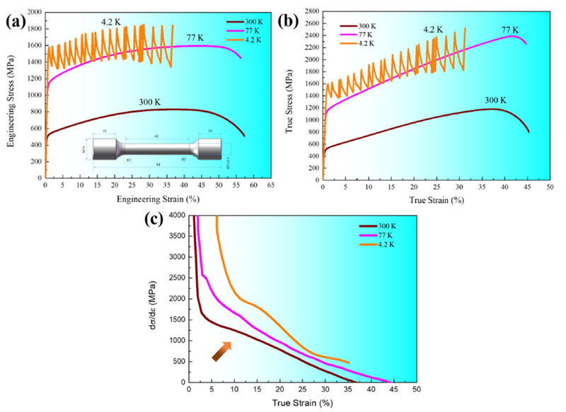 图2 Fe-Cr-Ni-M-N奥氏体不锈钢不同温度下的拉伸性能:(a)应力-应变曲线,(b)真应力-真应变曲线,(c)加工硬化曲线。4.2 K条件下屈服强度高达1.5 GPa,抗拉强度达1.85 GPa,断后伸长率达36 %。