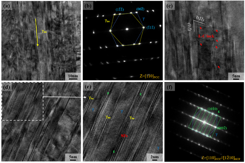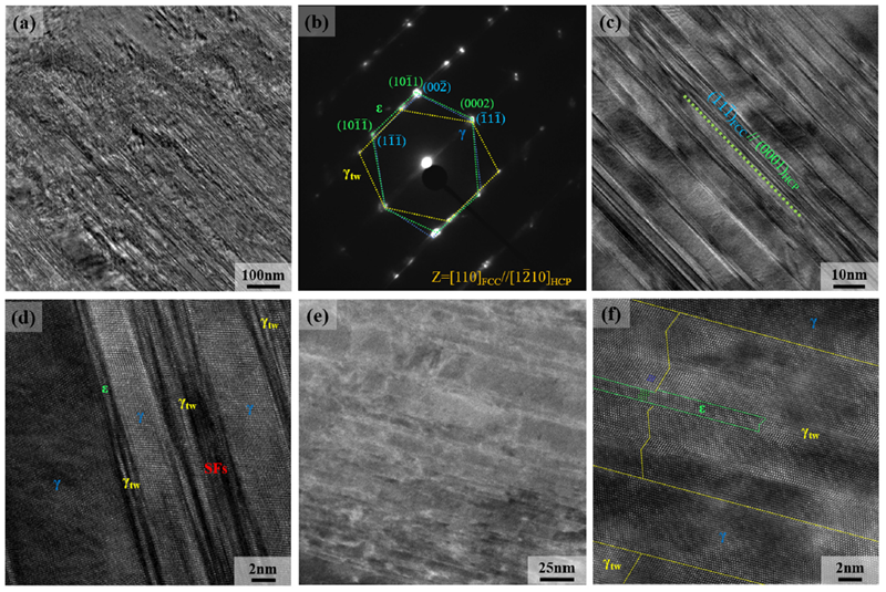 图3 77 K温度下变形机制:(a)HRTEM图,(b)SAED图,表明高密度的纳米孪晶和FCC→HCP马氏体相变的形成,(c)TEM图显示FCC-HCP片层双相结构,(d)变形孪晶(γtw),层错(SFs)和马氏体相变(ε)的放大图,(e, f)高分辨率HAADF-STEM图。
