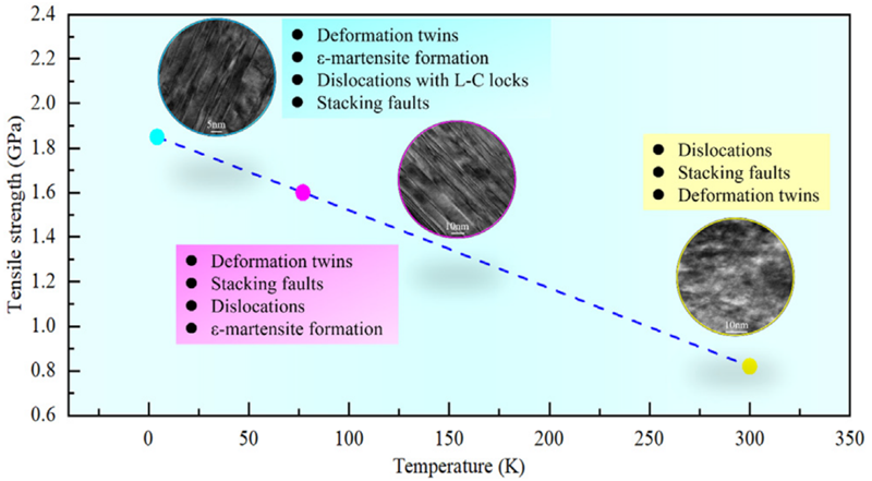 松山湖材料实验室王维研究员与中国科学院理化所李来风研究员团队合作,通过研究Fe-Cr-Ni-M-N奥氏体不锈钢在塑性变形过程中的组织演变,发现室温条件下材料的变形组织主要由位错、层错和变形孪晶组成。当变形温度降低至液氮温度(77 K)和4.2K时,变形孪晶的体积分数逐渐增大,位错滑移显著受到抑制,变形孪晶主导了塑性变形过程。此外,还发现低温下仍存在纳米尺寸的ε-马氏体转变。不同温度下的内部位错、层错和变形孪晶以及少量ε-马氏体组织之间的相互竞争、相互促进,共同实现不锈钢宽温区优异的综合强塑性。