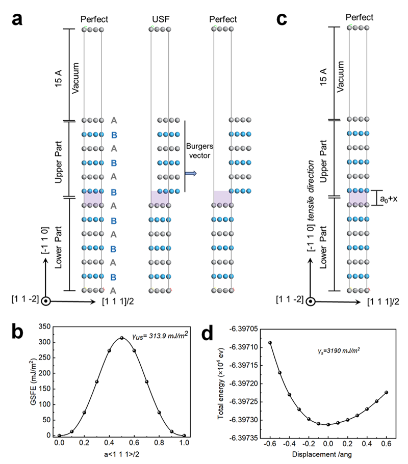 图1 选定的难熔高熵合金体系(Ti42Nb21Hf21V16)合金的第一性原理计算。a,包含堆垛层错的体心立方超胞。 b,第一性原理计算的广义堆垛层错能。 c,体心立方超胞的拉伸及压缩第一性原理计算。 d,通过 UBER 方法拟合的总能量与位移曲线计算其表面能。