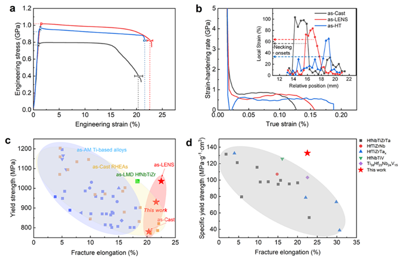 图2 该研究中的难熔高熵合金的拉伸性能。a,电弧熔炼(as-cast),增材制造(as-LENS)及后续热处理(as-HT)难熔高熵合金的拉伸应力应变曲线。b,加工硬化曲线。c,屈服强度及断裂延伸率的Ashby图。d,比强度及断裂延伸率的Ashby图。