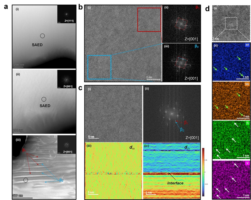 图3 该研究中的难熔高熵合金的微观组织及精细原子结构。a,纳米尺度下的采用不同方式制备的难熔高熵合金的组织形貌。b,增材制备的难熔高熵合金的原子结构及其基体的相分离。c,热处理能够显著促进基体相的进一步分解。d,原子尺度下的元素分布揭示难熔高熵合金中的局部的成分起伏。