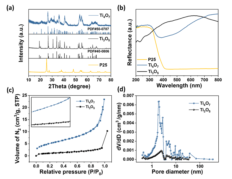 图2 钛氧化物的表征:(a) XRD谱图;(b) UV-Vis漫反射光谱;(c)氮吸附-解吸等温线;(d)相应的孔径分布曲线