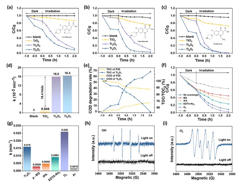图3 钛氧化物光催化(a) LEV;(b) CIP;(c) NOR的降解曲线;(d)钛氧化物降解LEV的动力学常数;(e) Ti4O7和P25对LEV的COD和TOC去除曲线;(f)Ti4O7捕获活性物质的光降解曲线;(g)捕获实验降解效率直方图;(h) DMPO -•OH和(i) DMPO -•O2-的EPR光谱