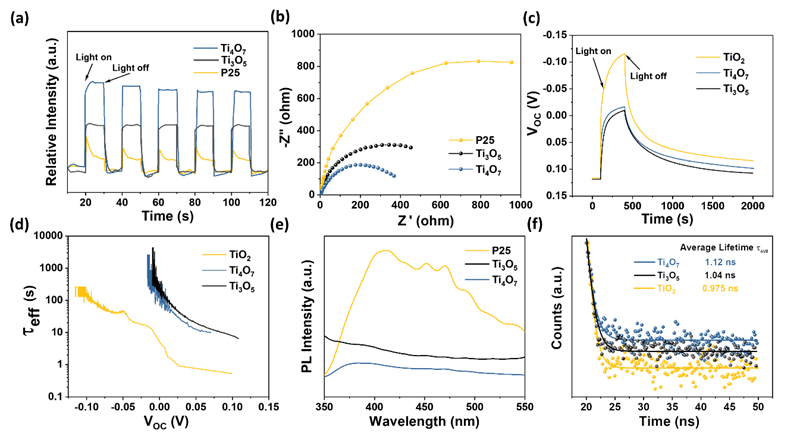 图4 钛氧化物的(a)瞬态光电流响应;(b) EIS Nyquist图;(c)开路电压衰减图;(d) 平均电子寿命;(e) PL光谱和 (f) 时间分辨光致发光光谱 (TRPL)