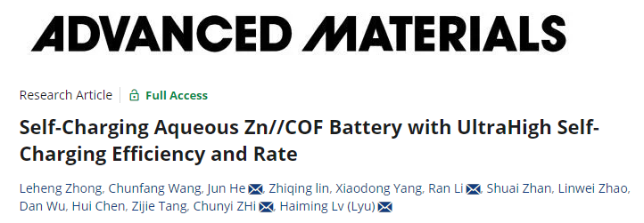 相关成果以“Self-Charging Aqueous Zn//COF Battery with Ultra-High Self-Charging Efficiency and Rate”为题在国际著名期刊Advanced Materials上发表。广东工业大学与松山湖材料实验室联合培养硕士研究生钟乐恒为第一作者,松山湖材料实验室副研究员吕海明,香港城市大学支春义教授,广东工业大学何军教授和延安大学李然副教授为共同通讯作者,上述研究工作得到了松山湖材料实验室创新样板工厂团队项目、广东省基础与应用基础基金等支持。