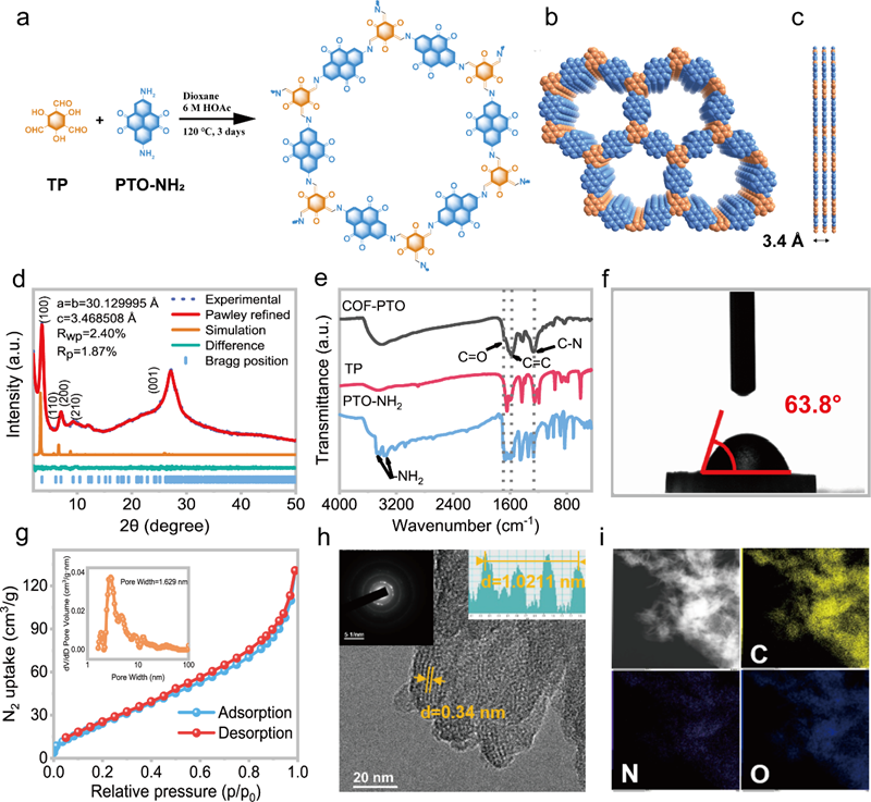 图1:COF-PTO的合成和表征:a) 合成路线图,b、c) AA堆积模型的俯视图和侧视图, d) 实验与模拟的PXRD谱图以及Pawley精修,e) FT-IR光谱,f) 接触角测试,g) BET测试,h) HRTEM和SAED图像,i) TEM图像及mapping