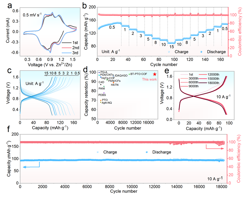 基于此,松山湖材料实验室水系电池团队,广东工业大学大学何军教授和延安大学李然副教授团队报道了含有芘-4,5,9,10-四酮基团的共价有机骨架(COF-PTO)作为水系自充电锌电池的阴极材料。COF-PTO的有序通道结构提供了出色的容量保留性能和超快速离子转移,在10 A g-1下循环18000次后容量保留率高达98%。为了直观地评价自充电性能,提出了自充电效率η和自充电速率ν用于性能评估。得益于丰富的C=O官能团,使得水系锌离子电池中Zn2+和H+双离子共同嵌入,实现优异的自充电性能,展现的自充电效率η和自充电速率ν均超过了之前的报道。此外,机理研究表明,COF-PTO中的C=N和C=O(苯上)互为邻位结构,很容易与Zn离子形成金属杂环,从而驱动自充电反应的向前进行,增强自充电性能。这项工作拓宽了COF材料在水系锌电池中的应用范围,为设计高效自充电电池铺平了道路。