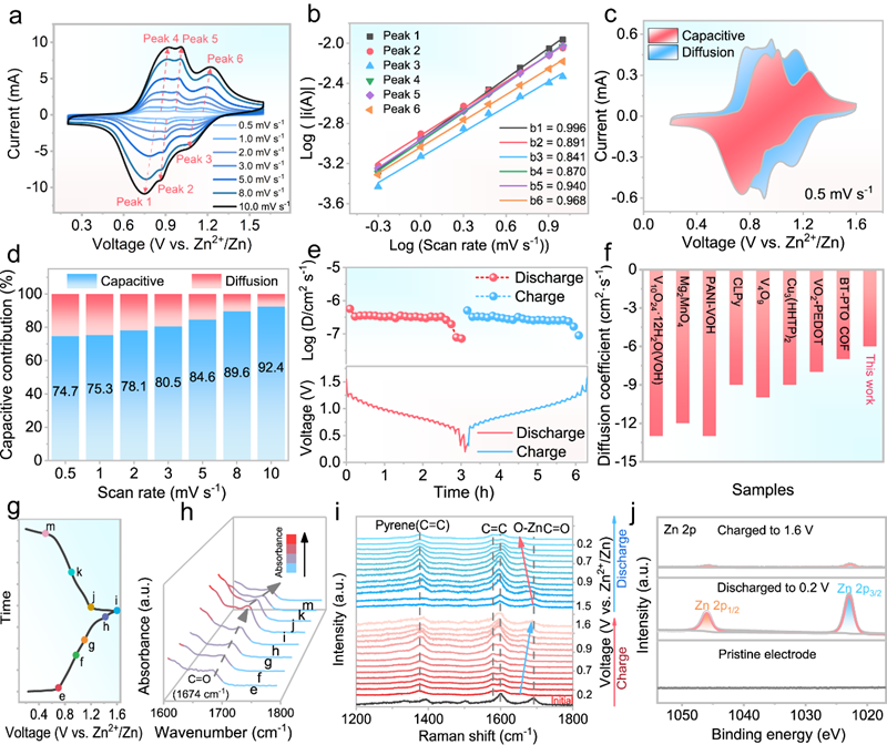 图3:COF-PTO的动力学分析及机理表征:a) 扫速为0.5-10 mV s-1下的CV曲线,b) 不同扫速下的b值, c) 0.5 mV s-1下的容量贡献,d) 不同扫速下的容量贡献,e) GITT曲线以及扩散系数,f) 扩散系数对比图,g)GCD曲线,h) FT-IR光谱,i)Raman光谱,j)充放电状态下Zn的XPS曲线