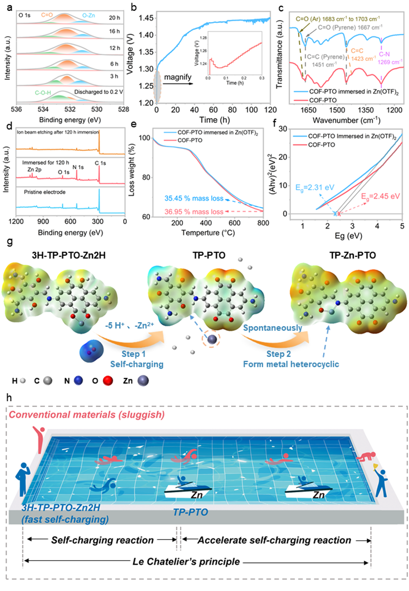 图5:COF-PTO的自充电机理:a) 不同自充电时间的O的XPS图,b) 浸泡电极的电压变化曲线,c) 浸泡120 h后Zn的XPS图,d) 浸泡120 h前后的FT-IR图,e) 浸泡120 h前后的热重曲线,f) 浸泡120 h前后的Tauc图,g) 自充电机理示意图,h) 促进自充电反应的勒夏特列原理示意图