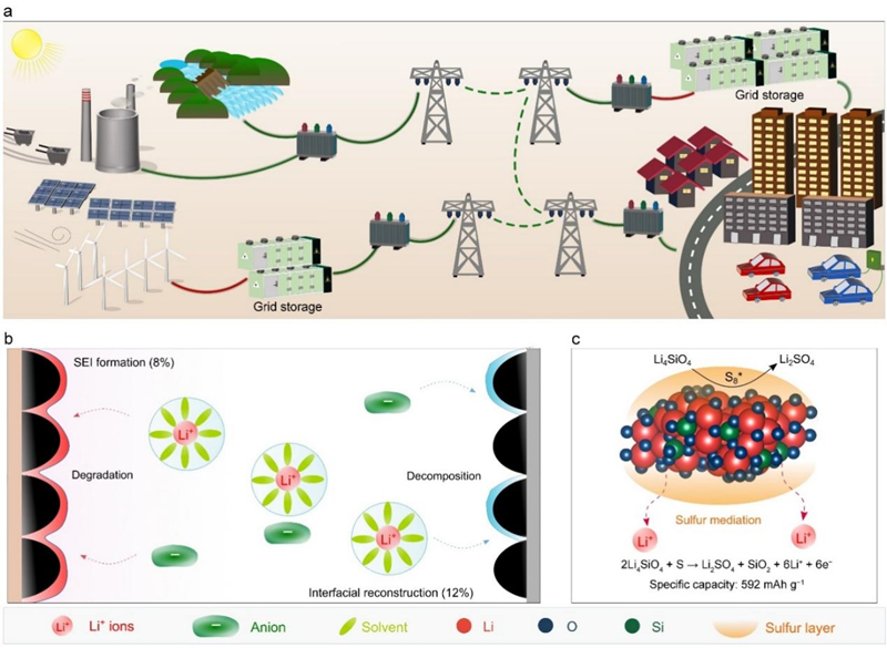 图1 DLR的概念图。a)基于电池系统的智能电网示意图。b)在长期循环过程中导致活性锂不可逆消耗的化学和电化学过程。c) DLR示意图:碳、硫双层包覆Li4SiO4,单质硫可以调节Li4SiO4的脱锂动力学。